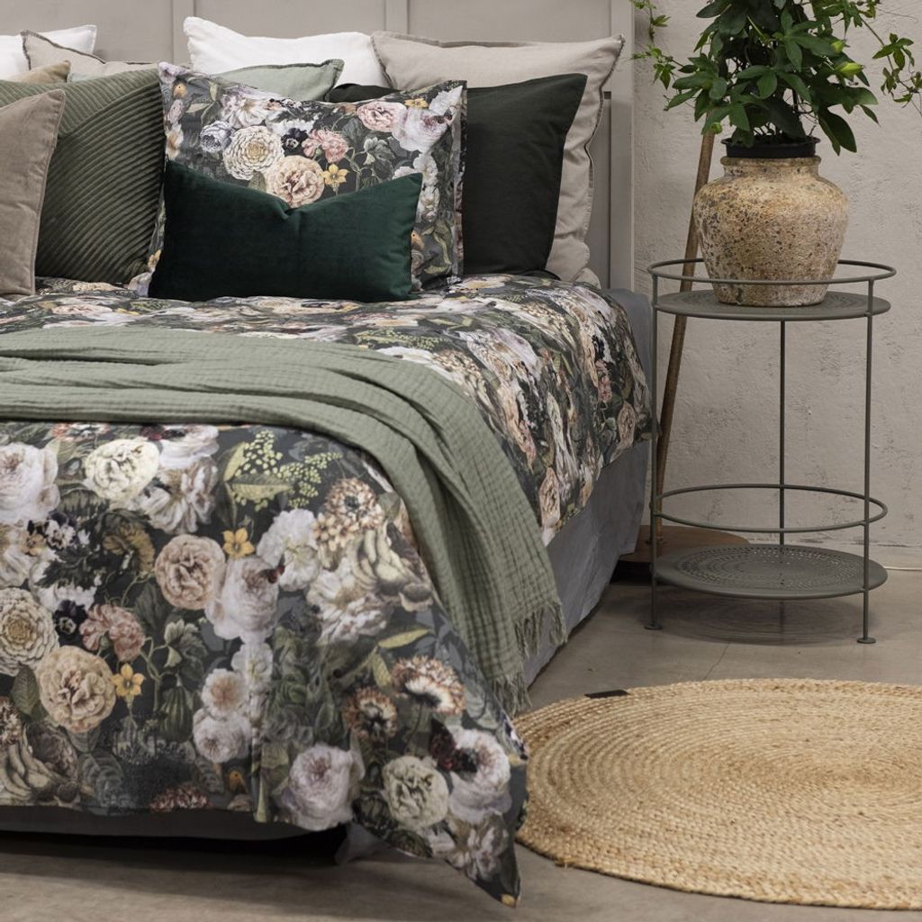 Abigail har ett romantiskt och vackert mönster av fina blommor i olika sorter på en vacker grön bottenfärg. Bäddsetet är tillverkat av 100 % bomull och har en unikhet i dess mönster som bidrar till intrycket av både en sommaräng och en bukett av höstliga blommor. Den mörka bottenfärgen hjälper till att få blommorna att stå ut från mängden på ett smakfullt sätt. Abigail är till för den som vill ta in ett fint blommotiv i sovrummet och som älskar looken av blomster!