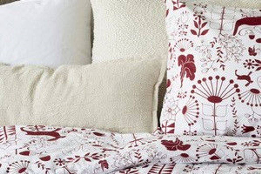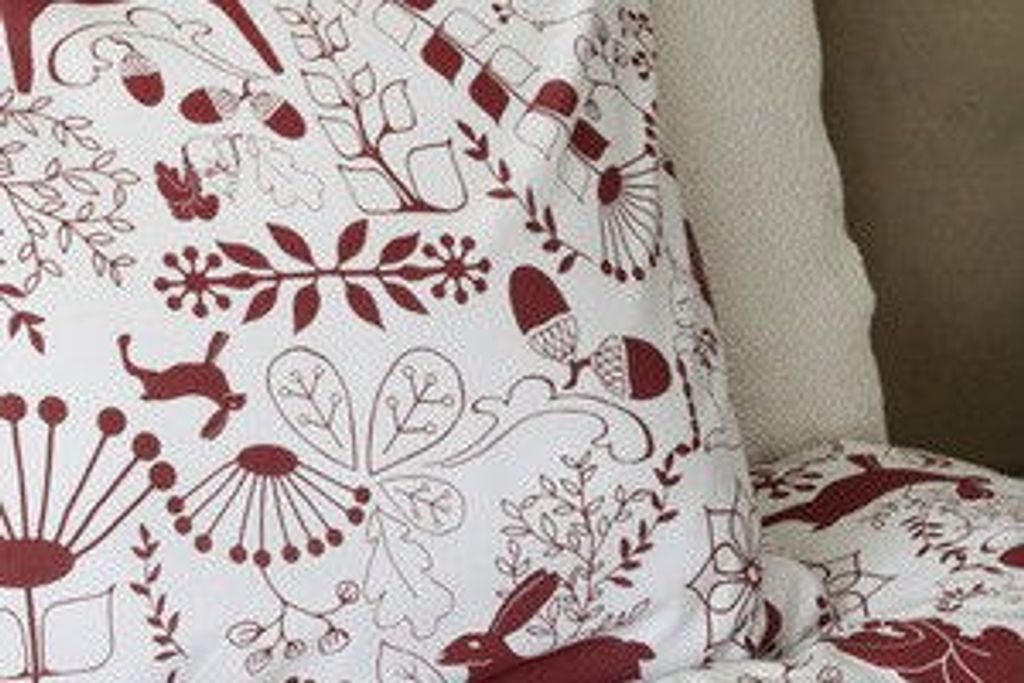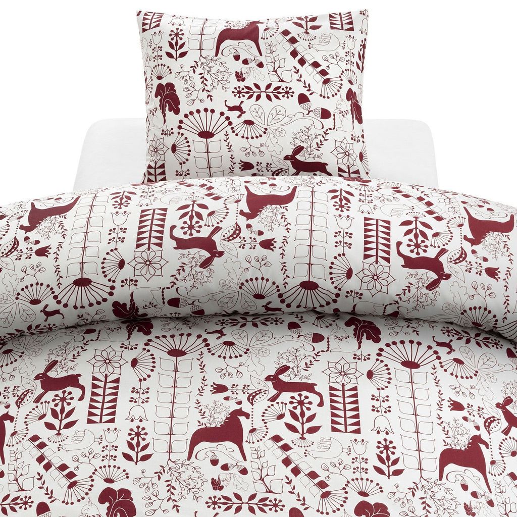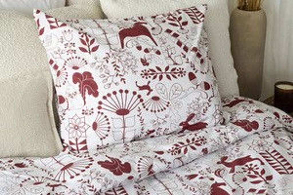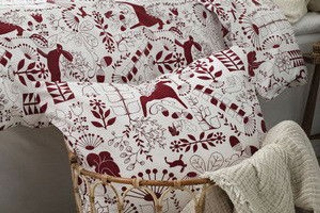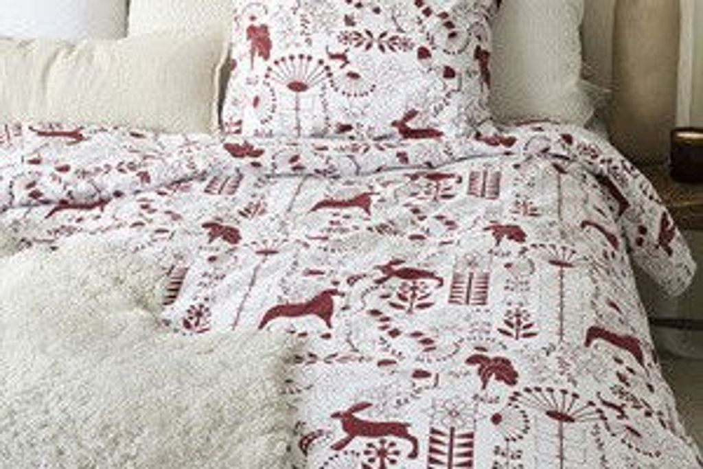 Bädda sängen i detta förtjusande julbäddset som sprider glädje och värme i sovrummet. Mönstret är rikt på detaljer med majestätiska älgar, stiliserade snöflingor, vackra julblommor och lekfulla folkloristiska element i en elegant vinröd nyans mot en ljus, varm bottenfärg. Designen kombinerar traditionell julkänsla med modern skandinavisk stil.