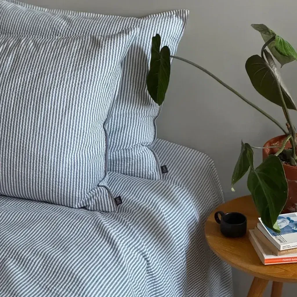 Bäckebölja är ett nytt och fint bäddset i ekologisk infärgad bomull som är mjukt och skönt att sova i. Bäddsetet har en fantastisk bäckeböljakvalitet som gör att det blir mjukt och upplevs som svalare. Bäddsetet har ett fint randigt mönster i en fräsch färgkombination av gråblått och vitt. Njut av bäckeböljan som ger en fin struktur till sovrummet, samtidigt som att få en bättre sovupplevelse!