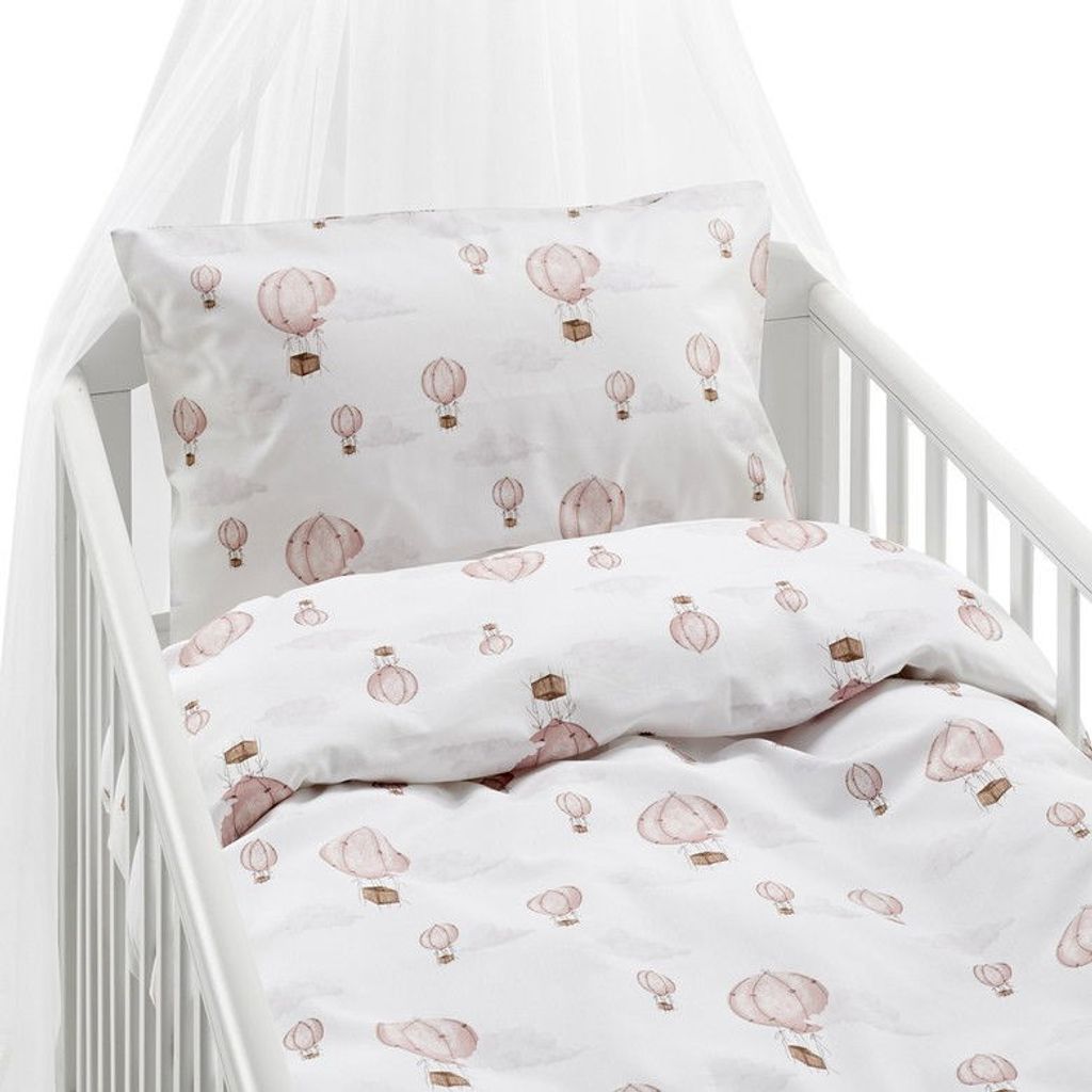 Ballong Rosa är ett bedårande 2-delars spjälsängset i 100% bomull med ett drömlikt mönster av luftballonger i rosa och beige toner. Trådtäthet 144 ger en mjuk och skön känsla mot barnets hud. Påslakanet har hörnhål och örngottet kuvertöppning för praktisk användning. OEKO-TEX MADE IN GREEN-certifierad för trygg sömn.
