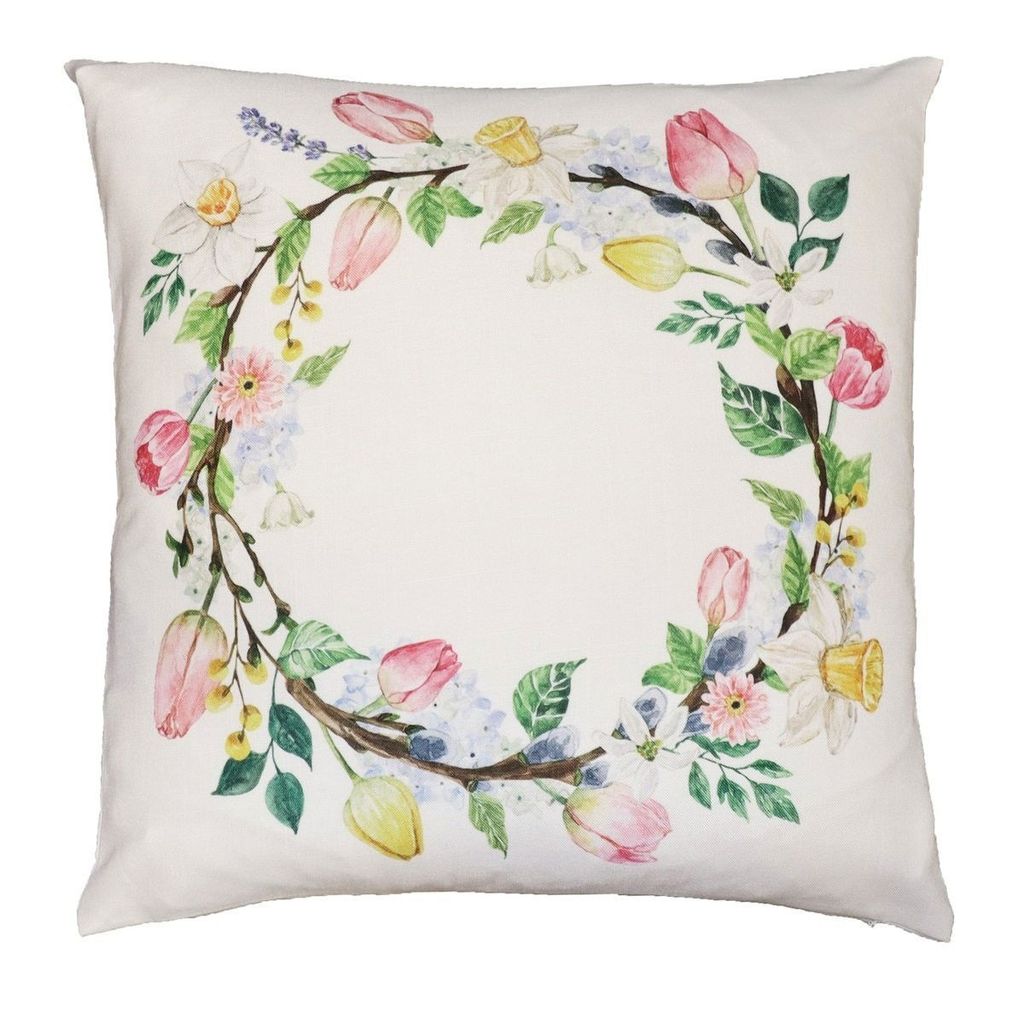 Blomsterkrans ger en vacker känsla till soffans nyheter. Kuddfodralet firar in våren med ett härligt digitaltryckt mönster av en fin blomsterkrans på framsidan och en enfärgad baksida. Kuddfodralet skapar textur och garanterar att vårkänslorna trillar in direkt när den landar i soffan!