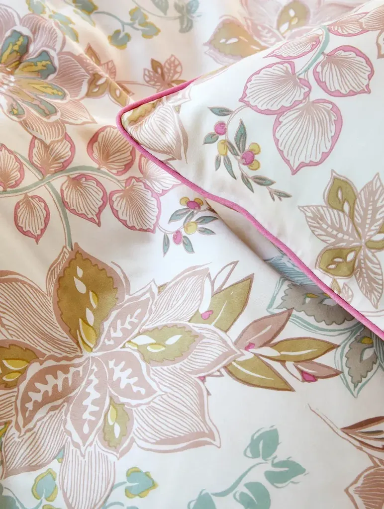Njut av ett vackert satinbäddset som påminner om en fin blomsteräng en varm sommardag! Cassandra har en dekorativ och dubbelsidig design av ett fint blommönster på framsidan med en kompletterande varmt rosa nyans på baksidan. Satinväven skapar lyster som ger glans till sängen och framhäver mönstret till dess fulla potential. Ett perfekt bäddset till den som vill få in sommarkänslan i sovrummet!