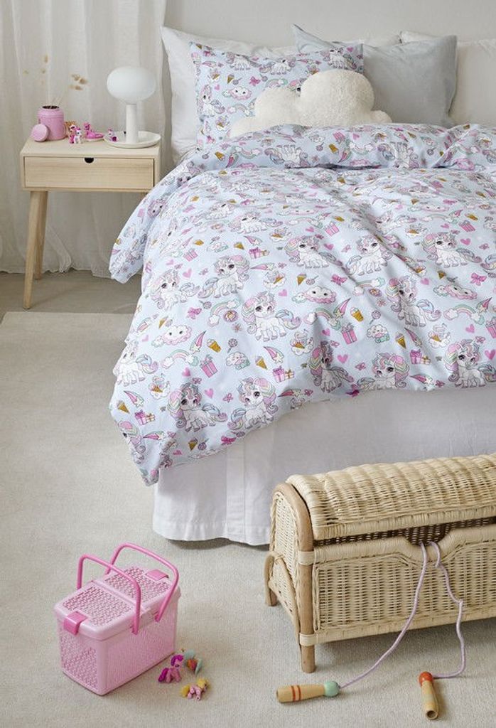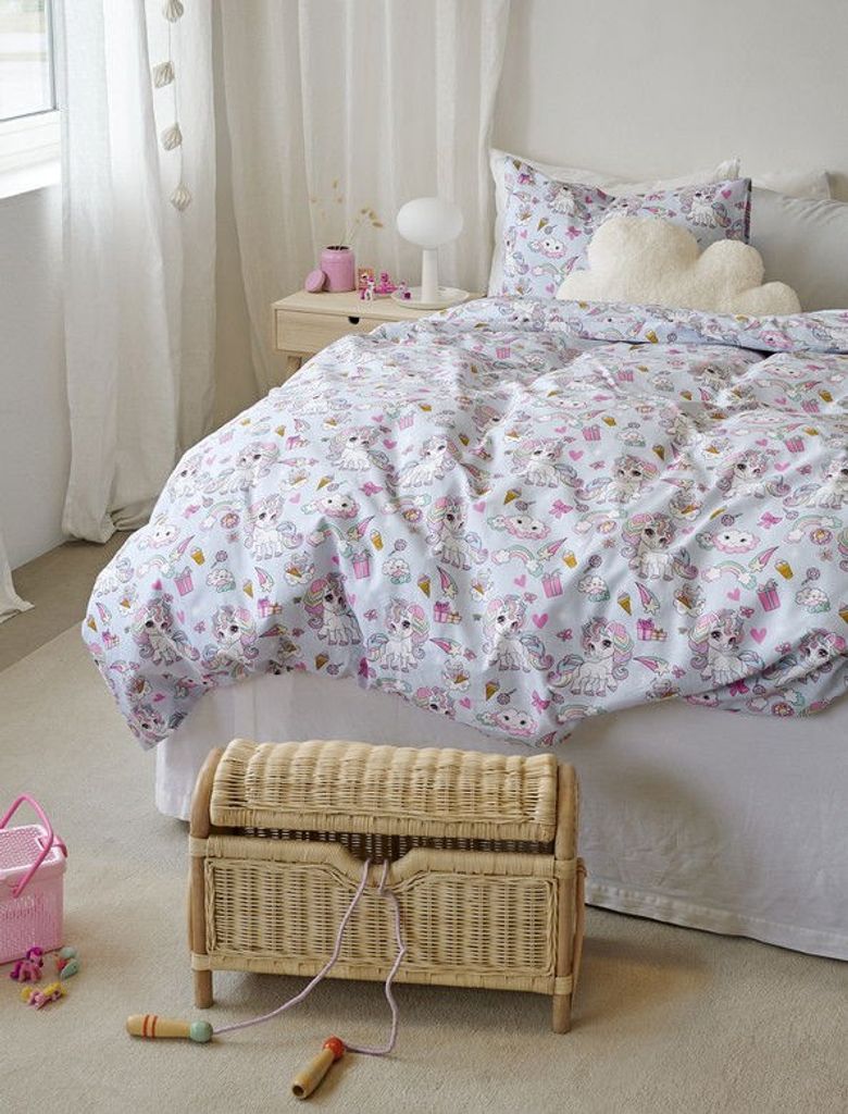 Enhörning är ett bomullsbäddset som tar dig till nya platser i dina drömmar! Bäddsetet har ett gulligt mönster av enhörningar, regnbågar, glassar, moln och presenter på en blå bottenfärg. Bäddsetet passar till den som älskar gulliga enhörningar och som vill färdas in i djupsömnen med ett härligt sällskap!