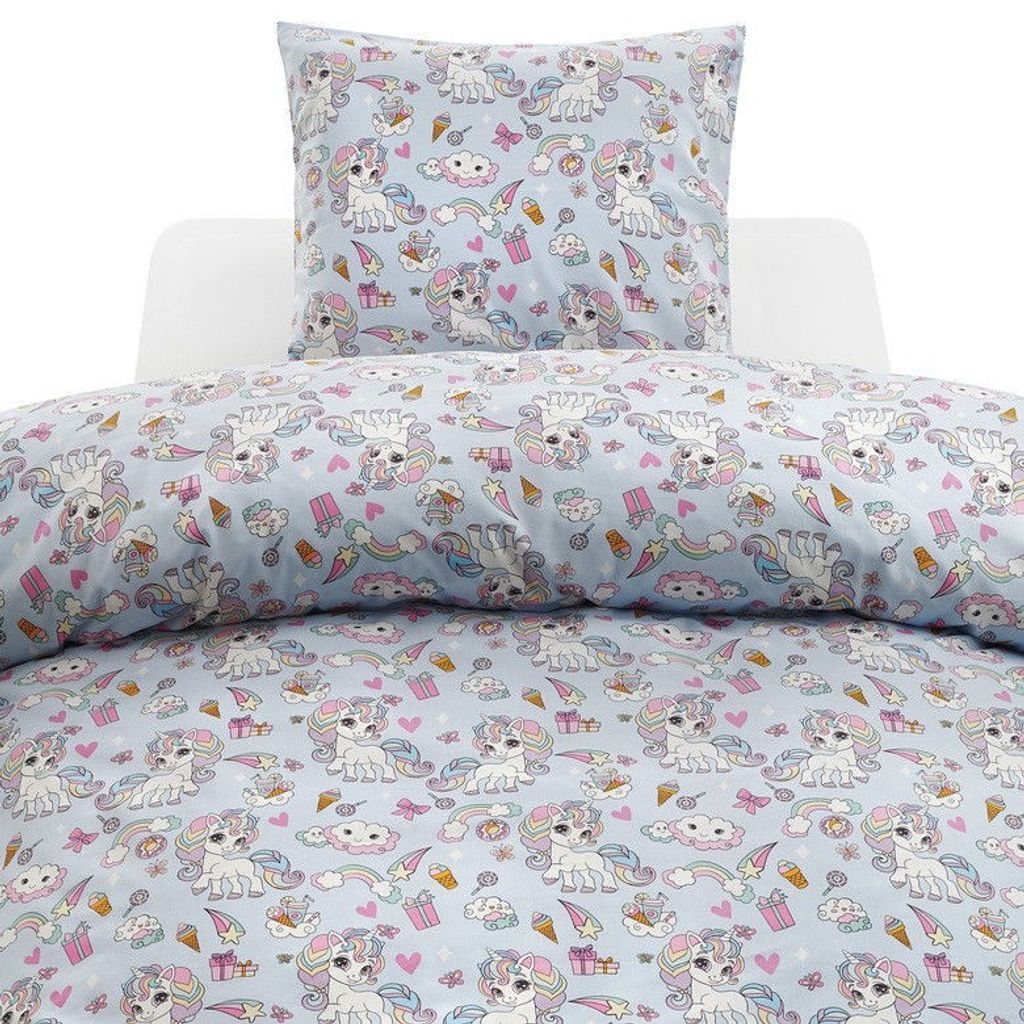 Enhörning Blå Barn Bäddset för enkeltäcke innehåller ett påslakan 150x210 cm och ett örngott 50x60 cm.