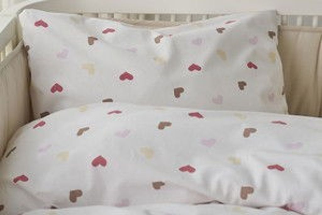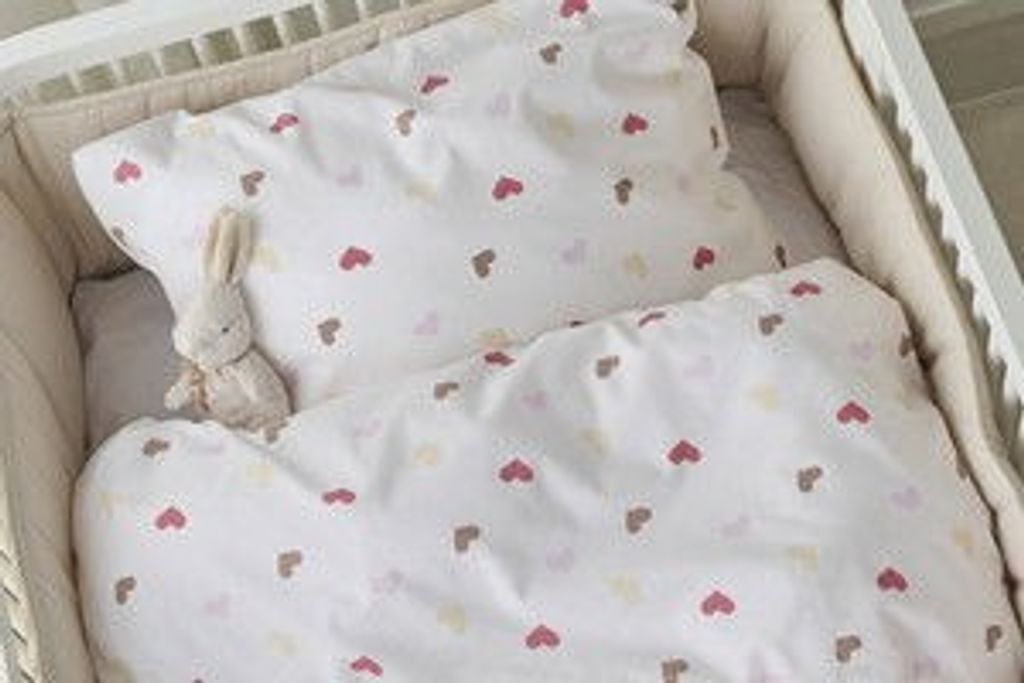 Hjärtrud Spjälsäng bäddset från Borganäs of Sweden med ett fint hjärtmönster i ljusa rosa, beige och bruna nyanser som skapar en varm och mysig känsla. Tillverkat av 100% OEKO-TEX-certifierad bomull som är mjuk, skön och fri från skadliga ämnen för ditt barns trygghet. Påslakanet har praktiska hörnhål och örngottet kuvertöppning för enkel bäddning. Perfekt för att skapa en ombonad och trygg sovplats i spjälsängen.