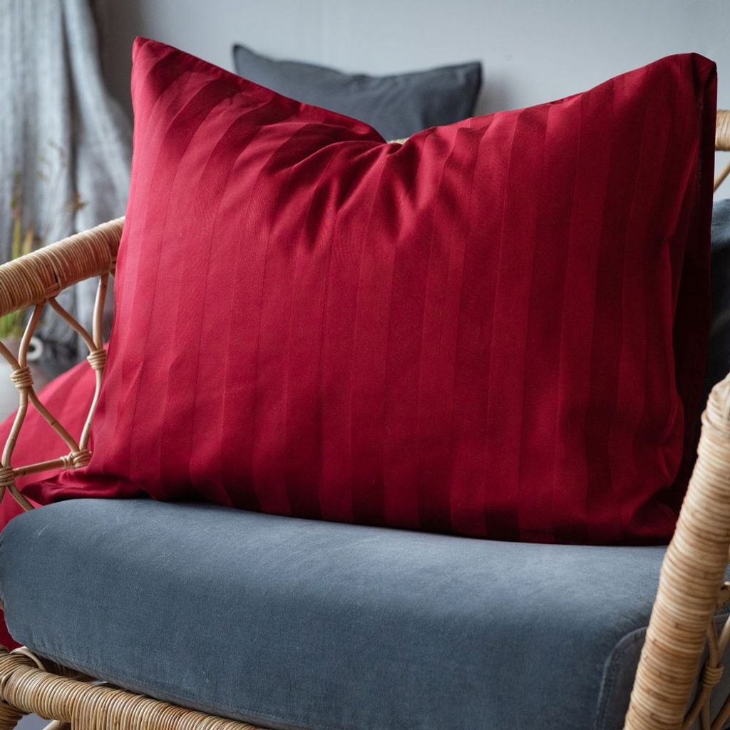 Sätt en guldkant på sovrummets upplevelse med detta påslakanset som är hotellinspirerat i en skön satinkvalitet. Påslakanet och örngottet är i en härligt röd nyans och är vävt med vertikalt matta och blanka ränder som ger ett fint lyster i alla vinklar. Hotellpåslakanet ökar lyxkänslan med dess stilrena utseende och blir extra tilltalande när ljuset lägger sig på och lyser upp sovrummet på ett fint och behagligt sätt.