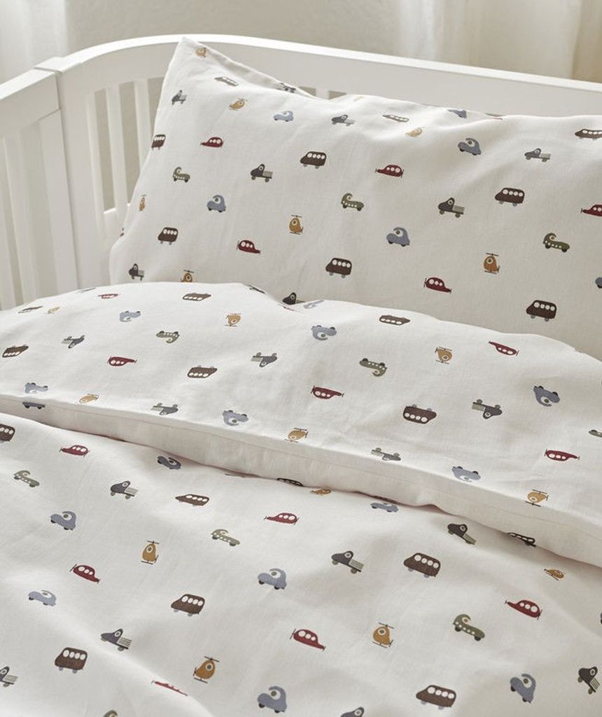 John Beige Bilar Barn för spjälsäng innehåller ett påslakan 100x130 cm och ett örngott 38x55 cm.