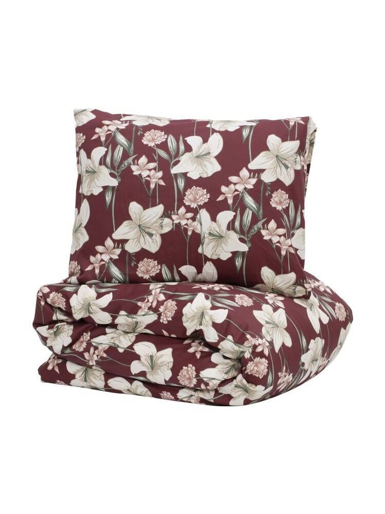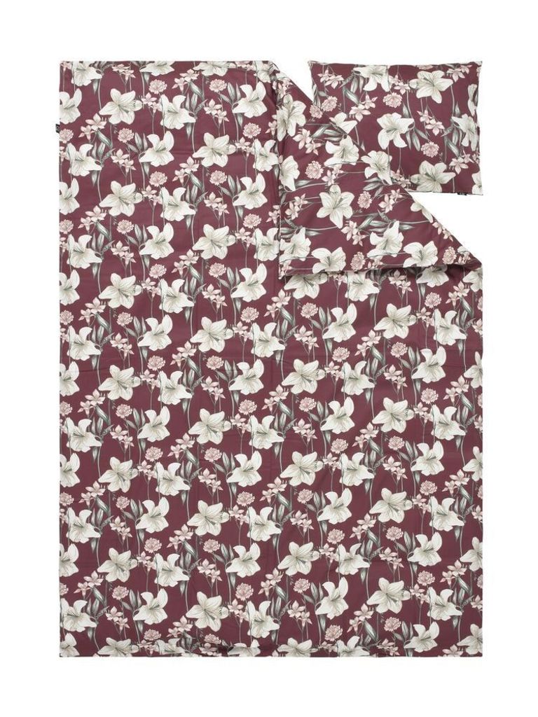 Kyrkosund Vinröd Blommigt Satin Bäddset Enkeltäcke 150x210 Kosta Linnewäfveri