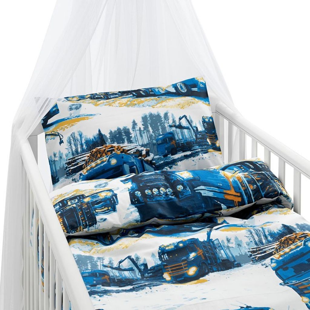 Lastbilar är tillverkat av 100 % bomull och har en trådtäthet på 144 TC, som gör att sängkläderna blir mjuka att sova i. Påslakanet har hörnhål upptill för en smidig bäddning och örngottet har en kuvertöppning som praktiskt håller kudden på plats hela natten.