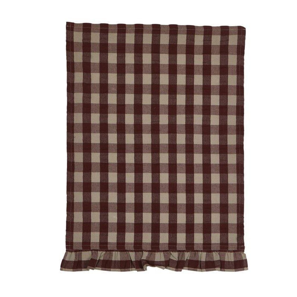 Klassisk kökshandduk i tidlöst vinröd-rutigt mönster med veckad volang. Tillverkad i 100% OEKO-TEX-certifierad bomull som kombinerar lantlig charm med modern funktionalitet.