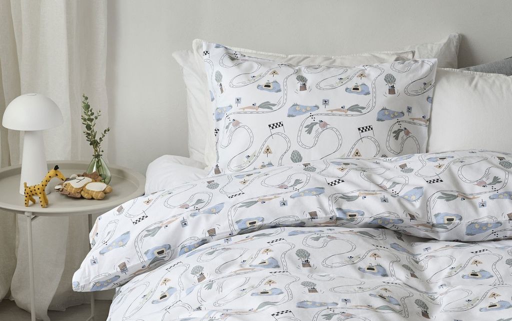 Mini Rally är tillverkat av 100 % bomull och har en trådtäthet på 144 TC, som gör att sängkläderna blir mjuka att sova i. Påslakanet har hörnhål upptill för en smidig bäddning och örngottet har en kuvertöppning som praktiskt håller kudden på plats hela natten.
