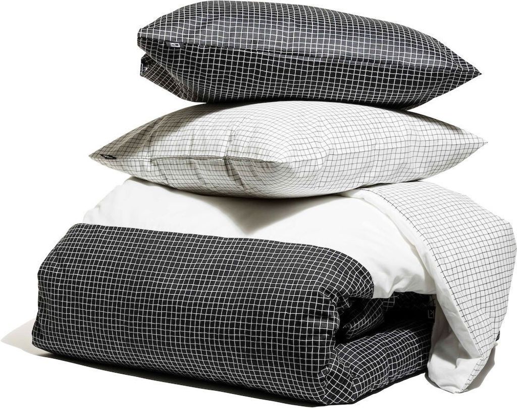 OK Check är ett bäddset av finaste satin med en rutig design av formgivaren och glaskonstnären Bertil Vallien. Satin vävs med två trådar åt ena hållet och en tråd åt andra hållet, vilket ger tyget ett fint lyster och känns sval och len mot kroppen. Påslakanet har hörnhål och örngottet har en kuvertöppning.