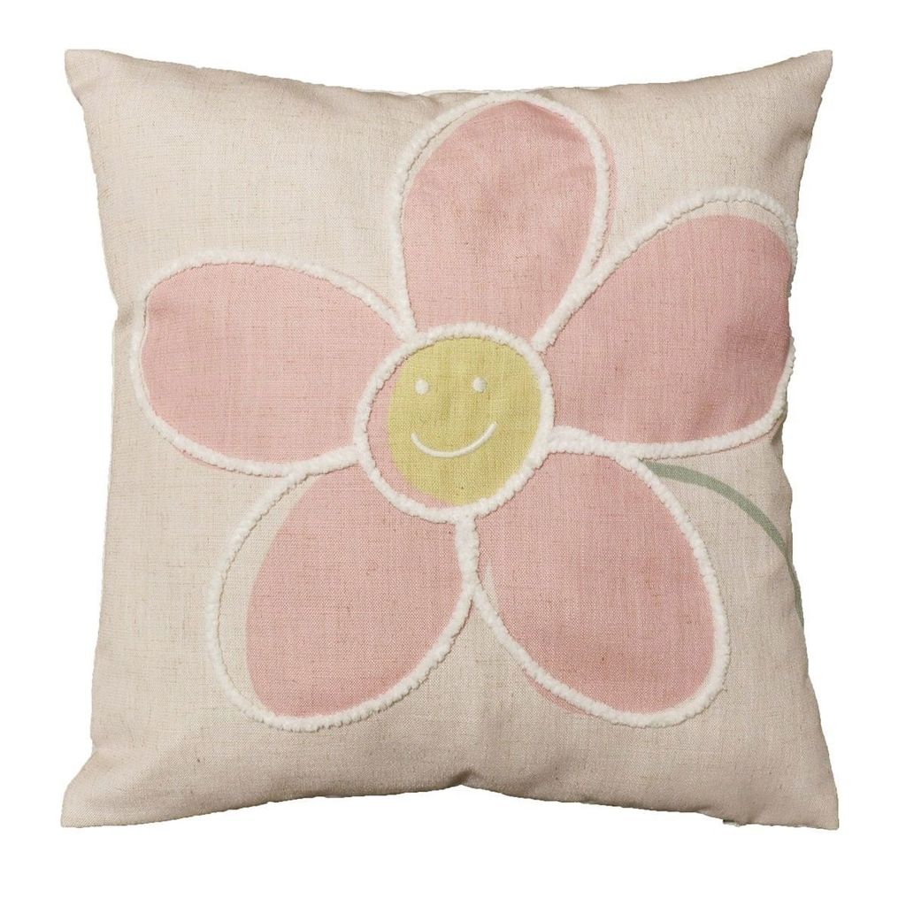 Smile ger en hög myskänsla till soffan tack vare den härliga materialblandningen av lin och polyester. Kuddfodralet har ett mönster av en stor, rosa blomma med ett smiley-ansikte samt mjuka konturer i en kort tufftning. Klä hemmets prydnadskuddar med Smile och upplev en positiv glädje redan från start på vårsäsongen!