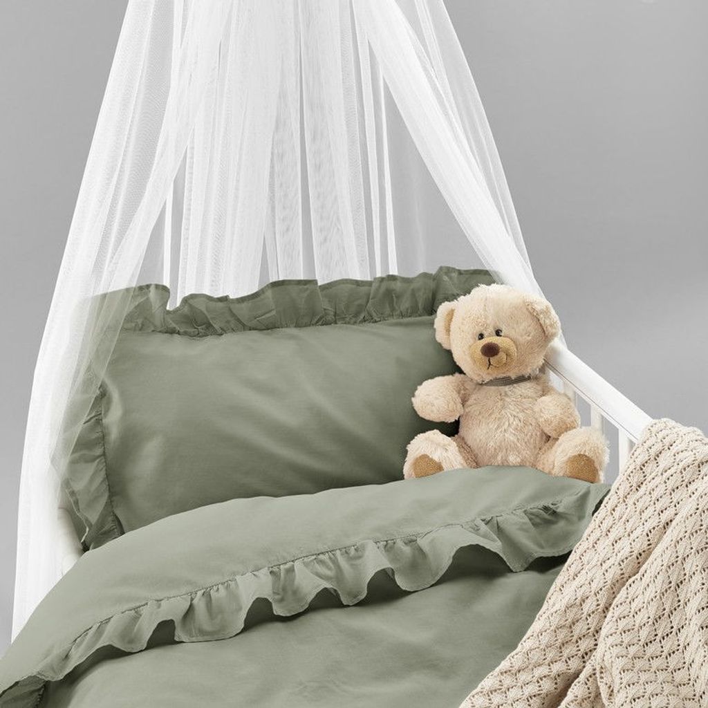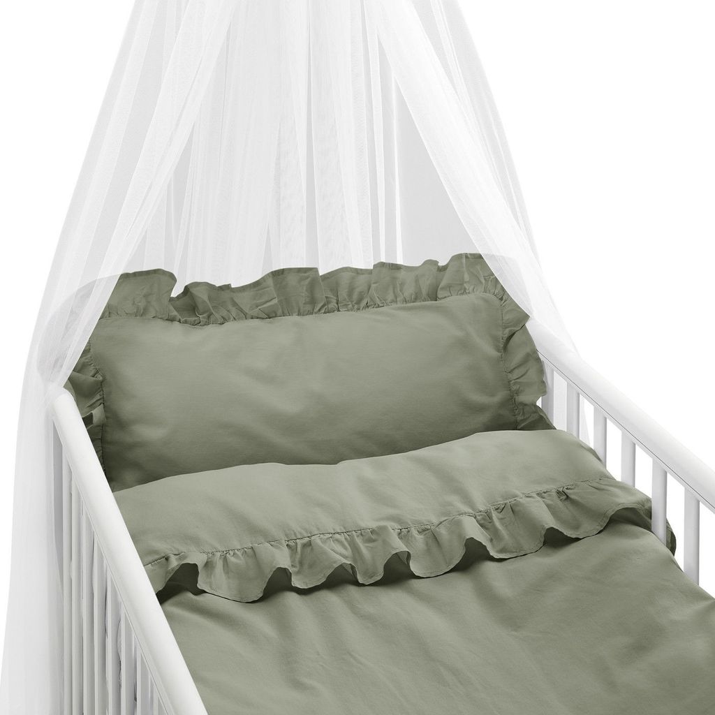 Volang är ett vackert spjälsängsbäddset i en mjuk percalekvalitet. Bäddsetet har en härligt grön nyans och tillsammans med volangen runt om örngottet och på påslakanet så skapas en kärleksfull känsla till barnrummet. Bädda fint i spjälsängen med Volang!