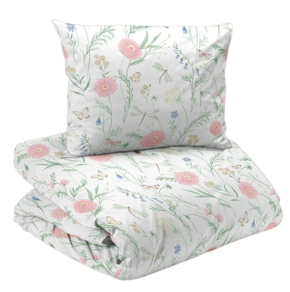 Amelia från Redlunds blir vårens favorit bland blomälskare. Bäddsetet har ett romantiskt mönster av vackra blommor i rosa, gula och blåa toner. Blommorna omsluts av gröna blad och vackra fjärilar och trollsländor som ger ett fantastiskt uttryck av en våräng. Njut av våren och sommaren och ta vara på alla sorters blomster, både ute och inne!