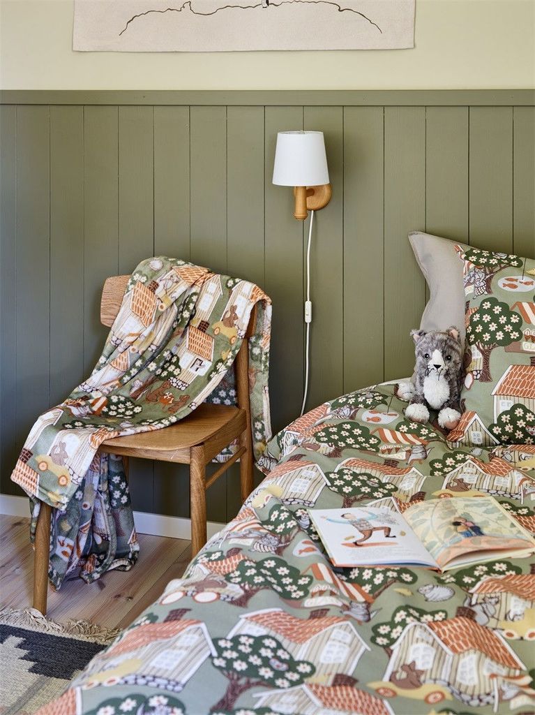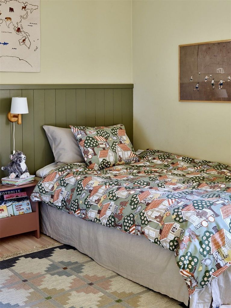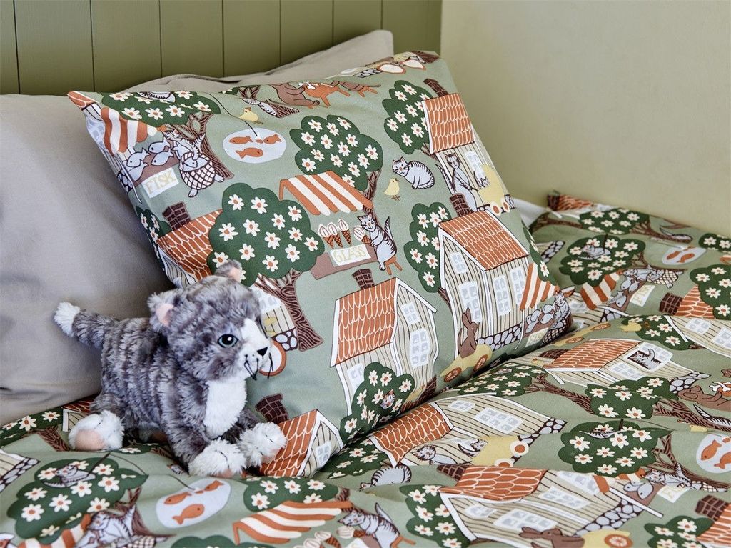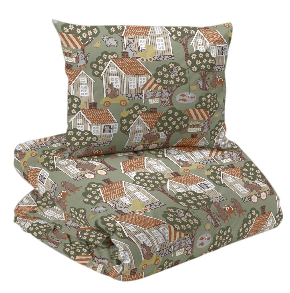 Åsgränd Grön Bäddset från Redlunds är en hyllning till svensk design och landsbygd. Med sina detaljerade hus och träd i jordnära färger på en grön bakgrund, skapas en lugn och harmonisk atmosfär i sovrummet. Tillverkat av 100 % BCI bomull, är det både mjukt och mycket hållbart. Setet är OEKO-TEX® certifierat, vilket garanterar en trygg produkt för både dig och miljön. Matcha gärna med filten i samma motiv!