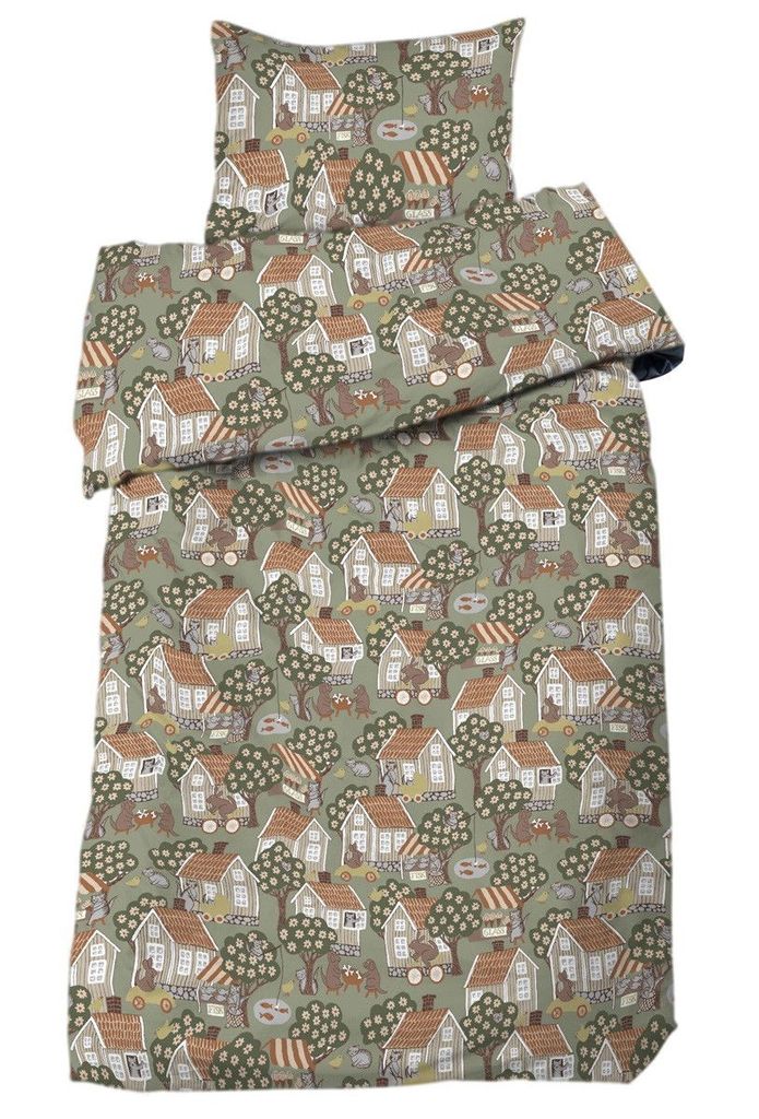 Med hörnhål upptill och öppning nedtill på påslakanet, samt en kuvertöppning på örngottet, är bäddningen enkel och smidig. Det charmiga mönstret med hus och träd ger en inbjudande känsla och gör ditt sovrum till en trivsam oas av lugn och ro.