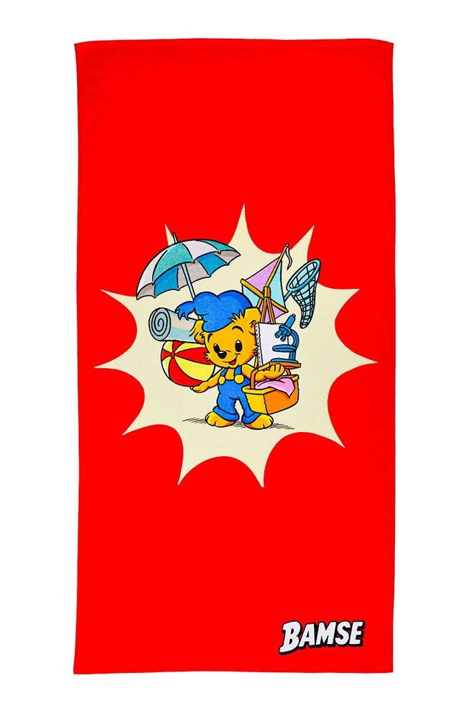 Bamse Stranden Röd Barn innehåller ett badlakan i storlek 70x140 cm.