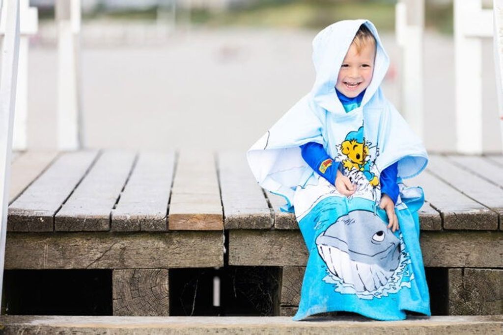 Bamse Val Blå Barn innehåller en badponcho i storlek 65x130 cm.