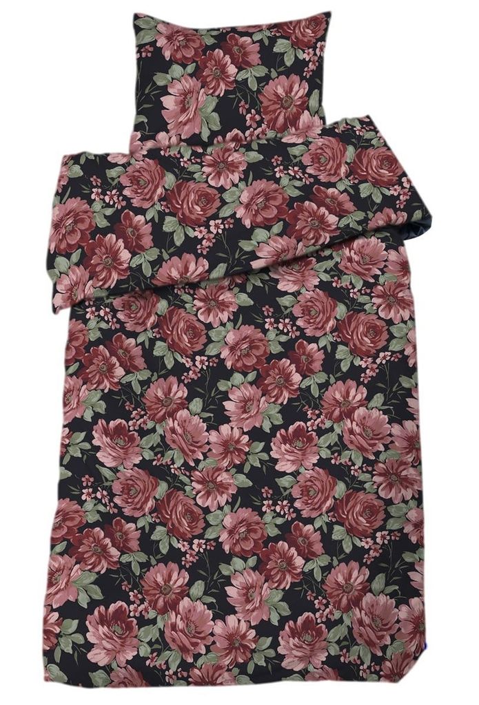 Romantiskt satinbäddset i 100 % bomull med ett stort blommönster i röda och rosa toner mot svart bakgrund. Med en trådtäthet på 200 TC och glansig satinväv ger det både en mjuk känsla och ett elegant uttryck.