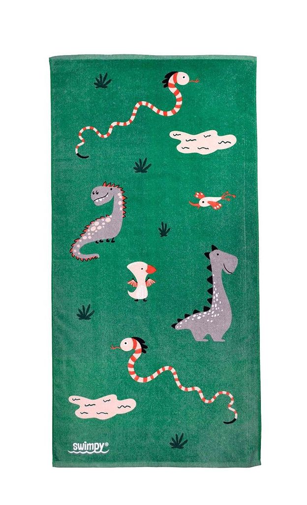 Dino är ett coolt badlakan från Swimpy by Tildas, som håller barnen varma och torra efter både badet hemma och trippen till stranden eller badhuset. Mönstret föreställer olika typer av dinosaurier i gråa och orangea nyanser som framhävs på en härligt grön bottenfärg tillsammans med loggan nedtill. Låt barnen få följa med Dino på äventyr i dinosauriedjungeln!