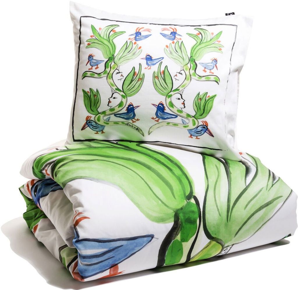 Fågelsång är ett bäddset med ett fantastiskt mönster skapat av den fantastiska konstnären Ulrica Hydman-Vallien. Med hennes underbara motiv i klara färger lyser hela sovrummet upp och skapar ett alldeles eget konstgalleri. Mönstret föreställande bland annat fåglar ger en mjuk och ljuv känsla tillsammans med tygets satinkvalitet.