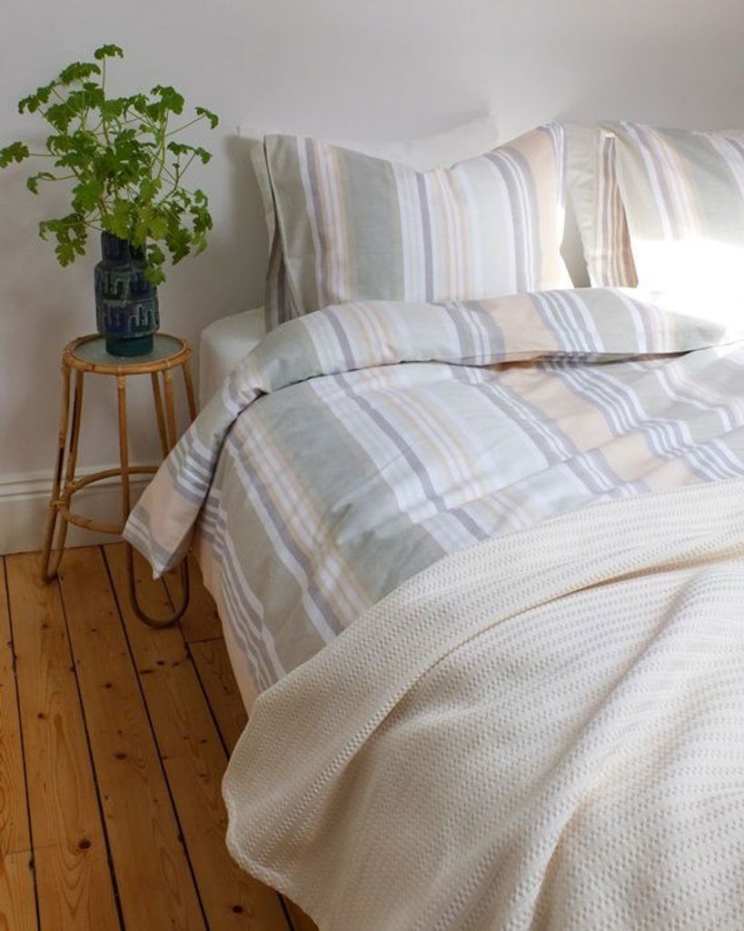 Harry är ett fint bäddset i ekologisk infärgad bomull som är mjukt och skönt att sova i. Med det ekologiska materialet bidrar bäddsetet till ett bra val för både människan och miljön. Bäddsetet har ett fint mönster av tjocka och smala ränder i gröna, blåa och beiga toner. Harry ger en skön upplevelse och bidrar definitivt till en god natts sömn med dess mjuka känsla!