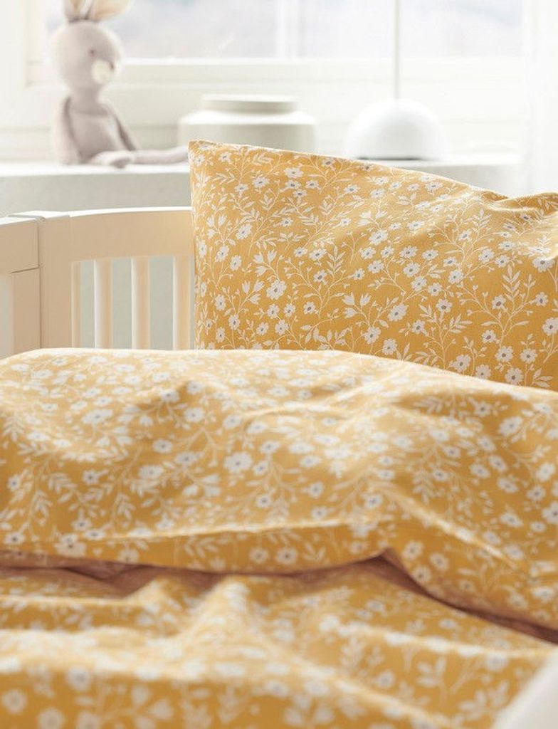 Hedda Gul Småblommigt för spjälsäng innehåller ett påslakan 100x130 cm och ett örngott 38x55 cm.