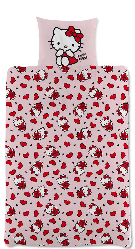 Gör sovrummet magiskt med detta söta Hello Kitty-bäddset! Hello Kitty kramar ett hjärta på ena sidan och lekfullt hjärtmönster på andra. Tillverkat i mjuk bomull med OEKO-TEX-certifiering för en trygg och skön sömn. Vändbar design ger två söta looks i ett! Innehåller påslakan 150x210 cm och örngott 50x60 cm.