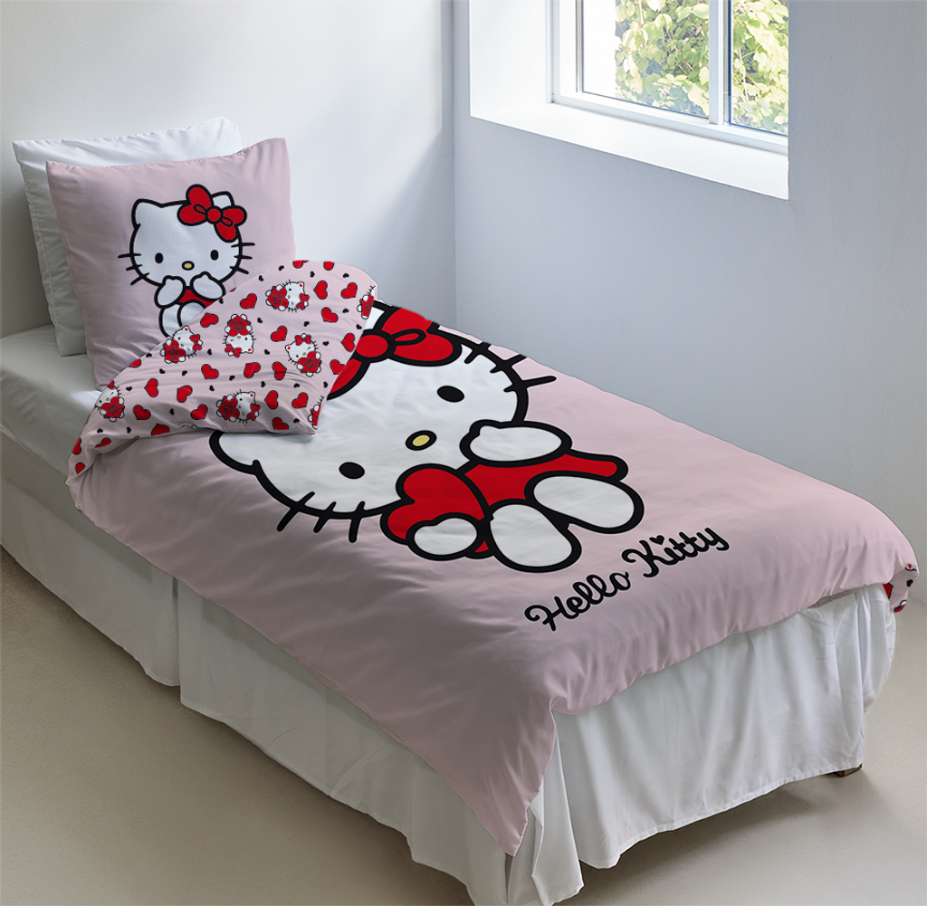 Bädda sängen i detta tjusiga Hello Kitty-bäddset som förvandlar sovrummet till en drömmig plats! Bäddsetet är tillverkat i mjuk och hållbar bomull med OEKO-TEX-certifiering, vilket garanterar att textilien är fri från skadliga ämnen och säker för barn.