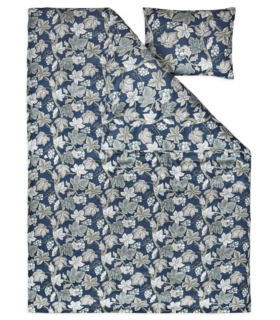 Hult går från grått till marinblått i en ny tappning av bäddsetet. Bäddsetet har ett mönster av löv och vindruvor i olika färger på en marinblå bottenfärg, som skapar ett mysigt inslag när hösten och mörkret är på ingång. Hult har en mjuk satinkvalitet som som inte bara ger ett lyxigt och stilfullt utseende i hemmet, utan det bidrar till en god natts sömn på bästa sätt i höstens ruskiga väder!