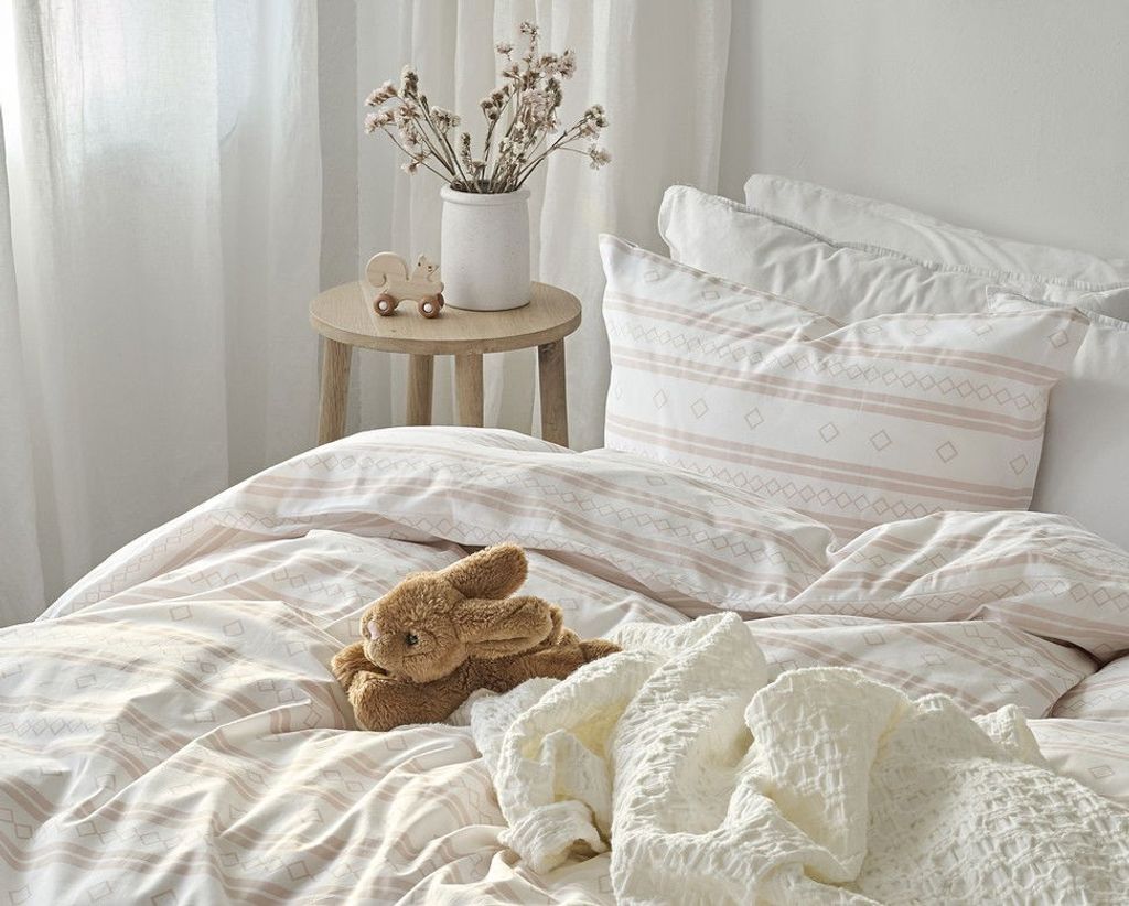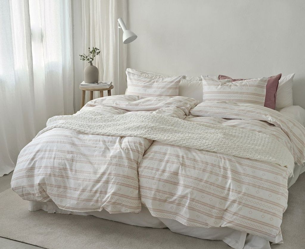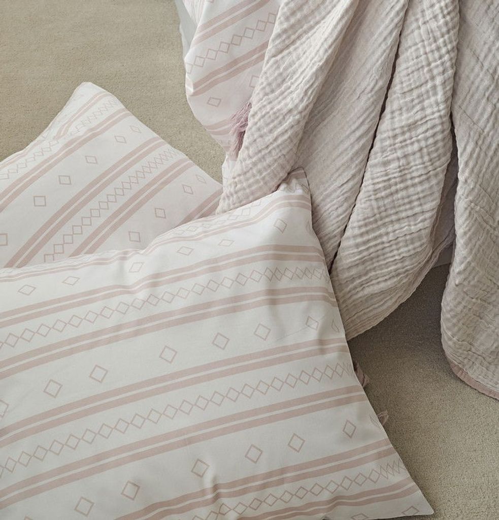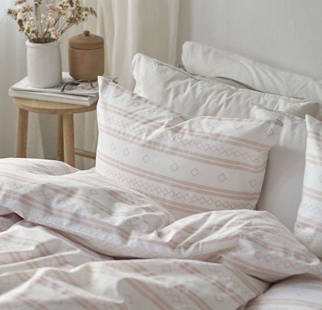 Inka är ett unikt bäddset med ett tryckt mönster som sticker ut med sina fina, horisontella linjer i rosa mot en vit bottenfärg. Linjerna består av tre mönster: två helfärgade linjer, en linje med små romber och en linje med större romber. Kombinationen av detta mönster ger ett härligt uttryck i sovrummet och skapar vårens härliga känsla direkt till hemmets viktigaste rum!