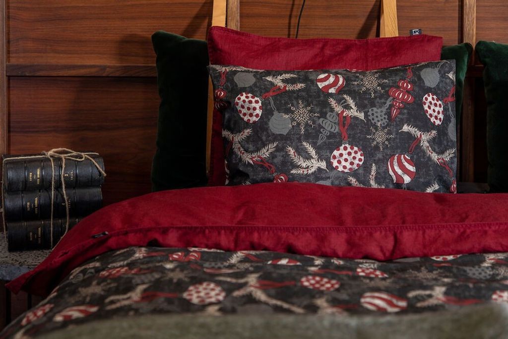 Julkula är ett juligt bäddset som välkomnar in julen på ett härligt sätt och är mycket skönt att sova i. Julkula har ett juligt mönster av olika designer på julkulor som hänger på grankvistar på en fin grå bottenfärg. Så bädda in julen i sovrummet och njut av en fint bäddad säng i vinter!
