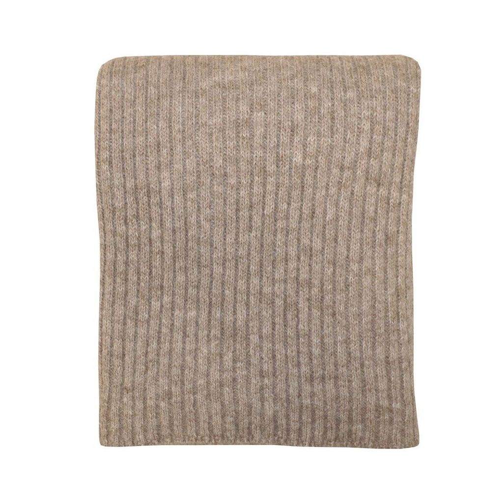 Stickad beige pläd med ribbad struktur och inslag av ull. Mjuk, värmande och lättskött – ett perfekt tillskott för både soffa och säng.