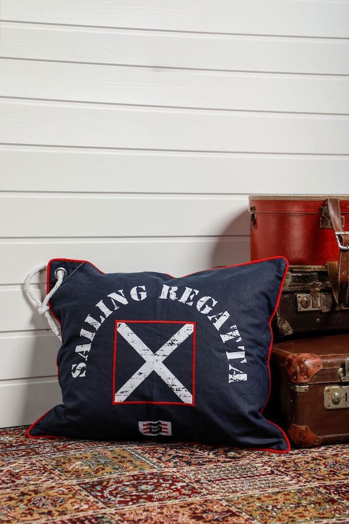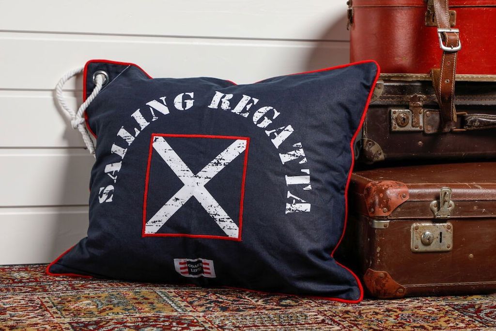 Kuddfodralet har en etikett med texten "Coast Life" och en större text "Sailing Regatta". I det vänstra hörnet finns en fin dekorativ detalj i form av en öljett med ett rep. Ta in havets härligheter med Lödde och njut av den maritima känslan!