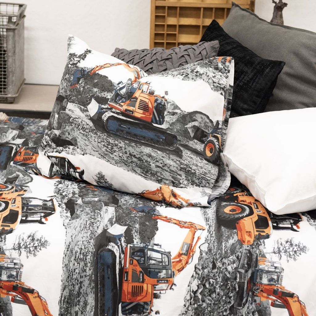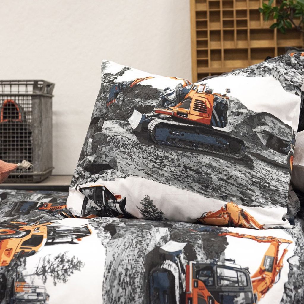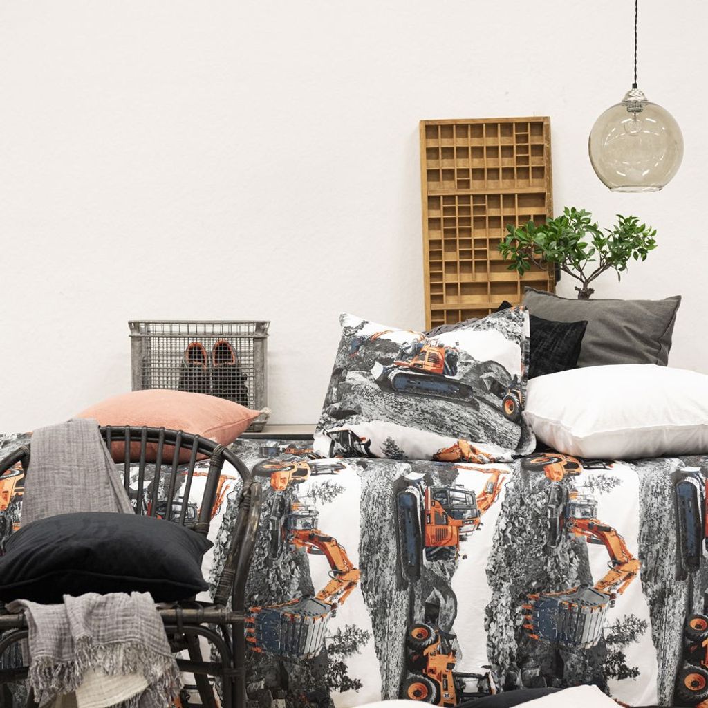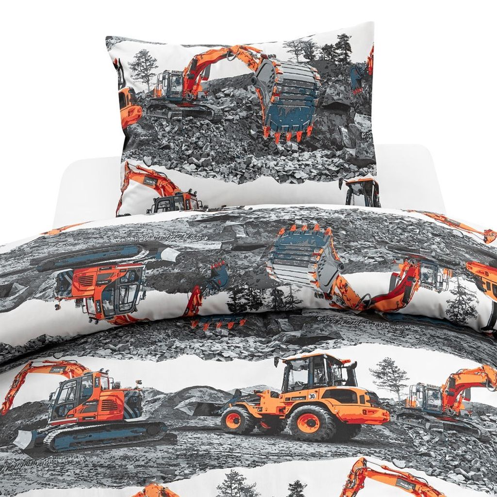 Maskiner är ett coolt bäddset från Borganäs of Sweden och har ett häftigt mönster av olika fordon. Grävmaskinerna är orangea som sticker ut på den gråvita bakgrunden. Ta kommandot för grävningen och se till att allt bygge blir rätt. Maskiner passar perfekt till den som älskar grävmaskiner och som vill utforska marken i drömmarna!