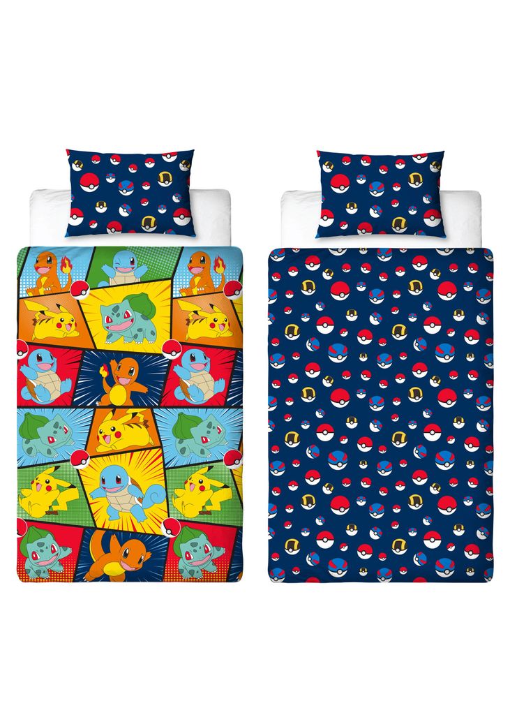Gör sovrummet magiskt med detta färgglada Pokémon-bäddset! Pikachu, Charmander, Squirtle och Bulbasaur i cool serietidningsdesign på ena sidan och Pokéball-mönster på andra. Tillverkat i mjuk bomull med OEKO-TEX-certifiering för en trygg och skön sömn. Vändbar design ger två roliga looks i ett! Innehåller påslakan 150x210 cm och örngott 50x60 cm.Retry