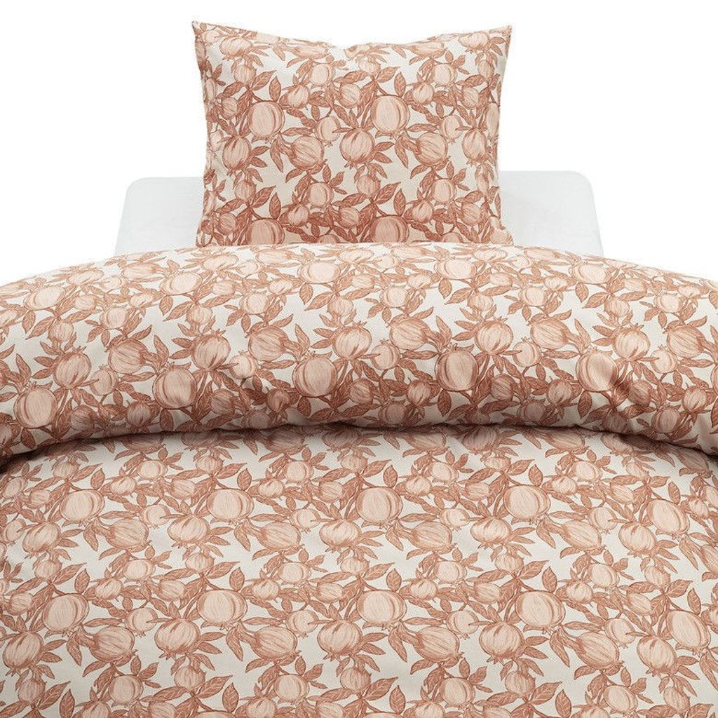 Pomegranate är ett härligt bäddset tillverkat av 100 % bomull av Borganäs of Sweden. Bäddsetet har ett unikt mönster av tecknade granatäpplen i en aprikos ton på en vit bottenfärg. Pomegranate skapar ett nytt uttryck i sovrummet med dess specifika mönster av granatäpplen och bidrar till att sängen blir extra smakfull att sova i!