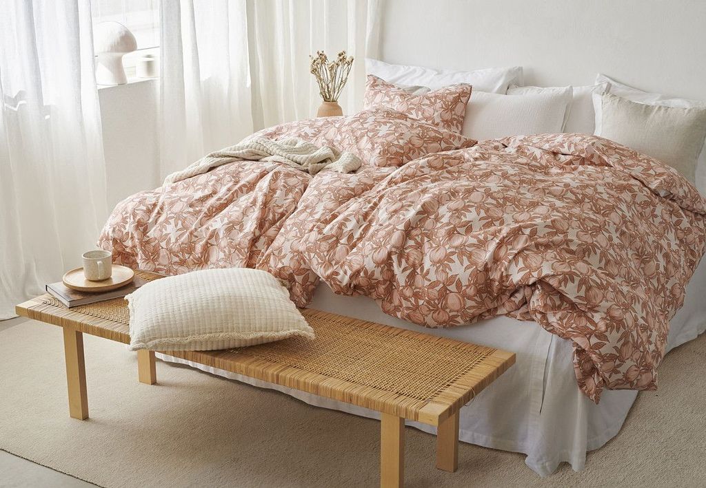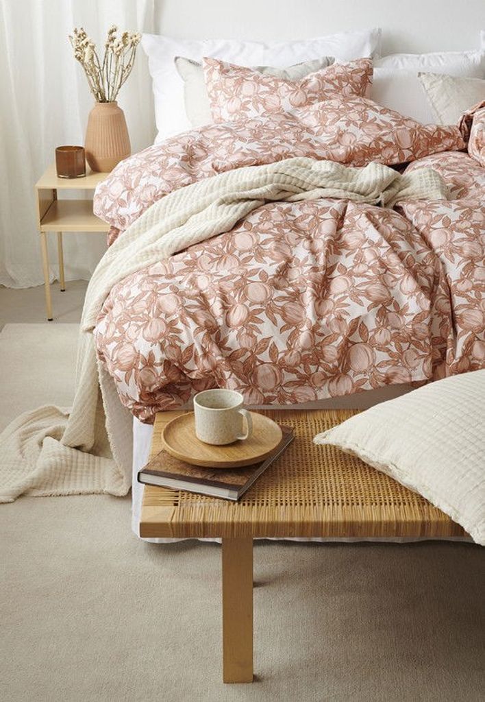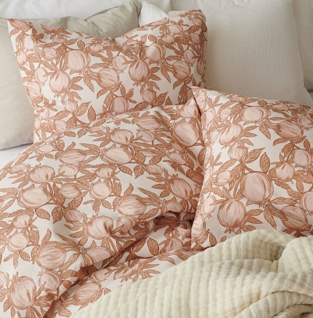 Pomegranate har ett mönster av tecknade granatäpplen i en aprikos ton på en vit bottenfärg. Bäddsetet är mjukt och skönt och skapar en annorlunda myskänsla utöver allt annat. Pomegranate skapar ett nytt uttryck i sovrummet med granatäpplena och bidrar till att sängen blir extra smakfull att sova i!