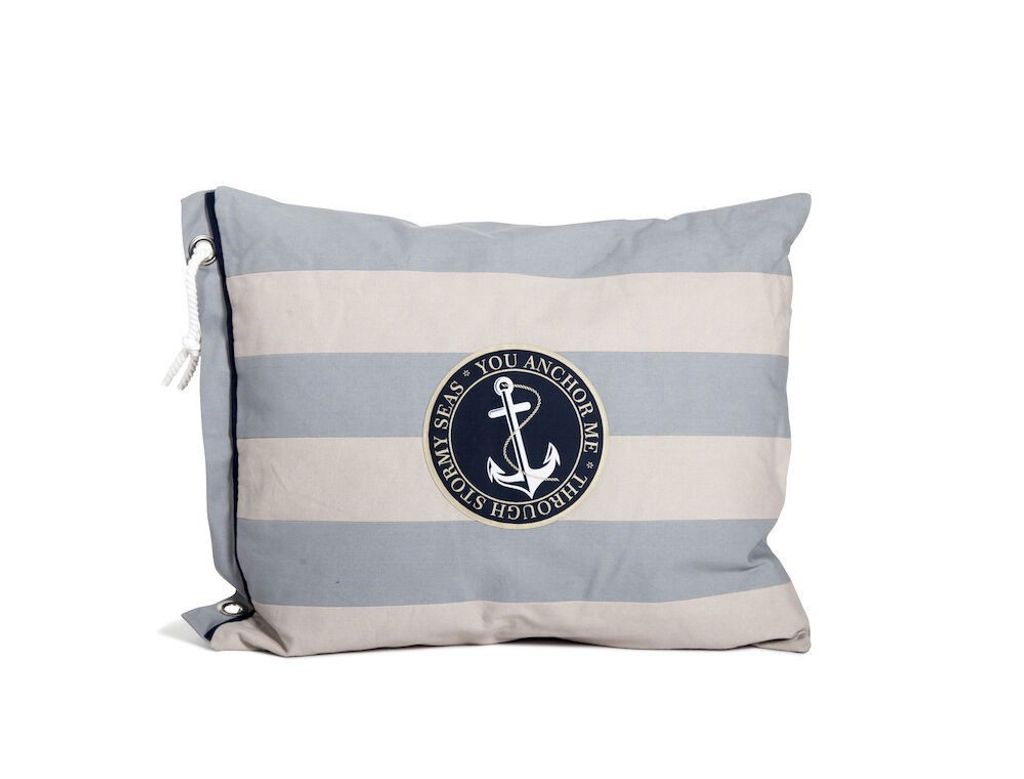 Rand är ett maritimt kuddfodral som är stilren och unik. Kuddfodralet har ett randigt mönster i grått och beiget med ett ankarmärke där det står "You Anchor Me. Through Stormy Seas". Här är det perfekta kuddfodralet som ökar havs- och sommarkänslorna året om!