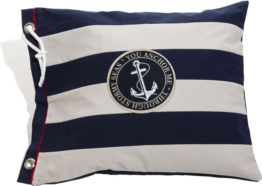 Rand är ett maritimt kuddfodral som är stilren och unik. Kuddfodralet har ett randigt mönster i marinblått och beiget med ett ankarmärke där det står "You Anchor Me. Through Stormy Seas". Här är det perfekta kuddfodralet som ökar havs- och sommarkänslorna året om!