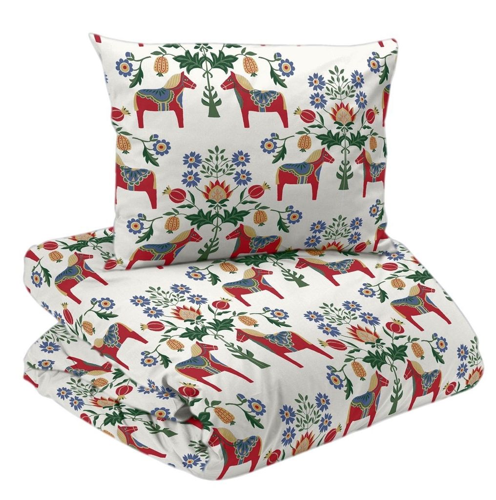 Bäddsetet Risa från Redlunds är tillverkat av BCI-bomull som gör det mjukt och skönt att sova i. Dekorera sovrummet med ett klassiskt svenskt mönster av fina dalahästar på en krispigt vit bottenfärg. Dalahästarnas röda färg förstärks mot den vita bakgrunden och tillsammans skapar de en vacker färgklick till sängen. Inspireras av svensk kultur och ta med den in i hemmets viktigaste rum!