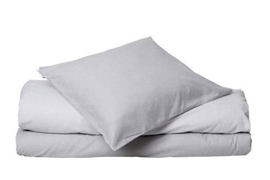 Runmarö Baby Randigt Chambray Grå/Vit för vagga eller vagn innehåller ett påslakan 70x80 cm och ett örngott 28x35 cm.