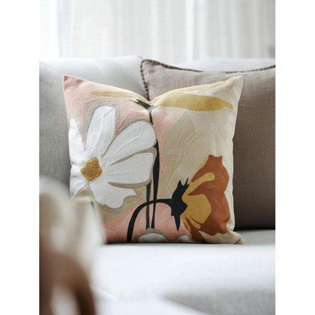 Elegant kuddfodral med vacker broderad design på framsidan. Det konstnärliga blommotiv i varma jordtoner av rosa, terrakotta, gult och vitt skapar en modern och exklusiv känsla.