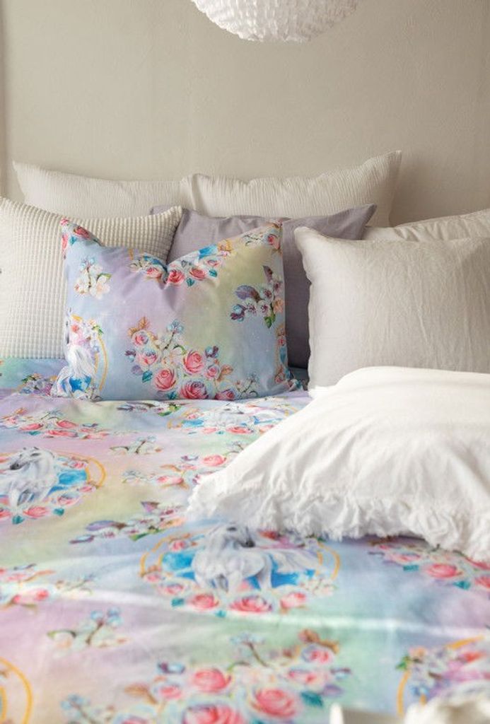 Spirit är ett färgsprakande bäddset med ett vackert enhörningsmotiv. De vita enhörningarna omfamnas av rosa rosor på en bottenfärg som går i en pastelligt lila och gul ton. Följ med Spirit på en makalös resa i drömmarnas land full med enhörningar!