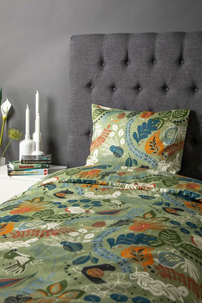 Bädda sängen med Stormhagen Grön som ger en ljuvlig färgklick till sovrummet på ett stilrent och smakfullt sätt. Det är inte enbart ett fint bäddset, utan det är en fantastisk inredningsdetalj som fångar ögonens uppmärksamhet direkt. Skruva upp känslan av lyx med det vackra och lekfulla mönstret av fåglar och blad i olika färger, som förstärks på en kompletterande bottenfärg i en härligt grön nyans.