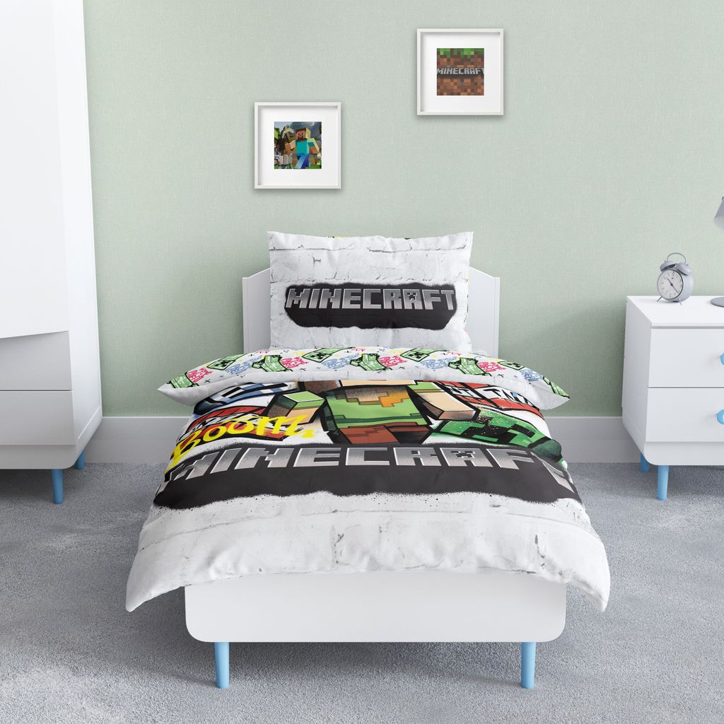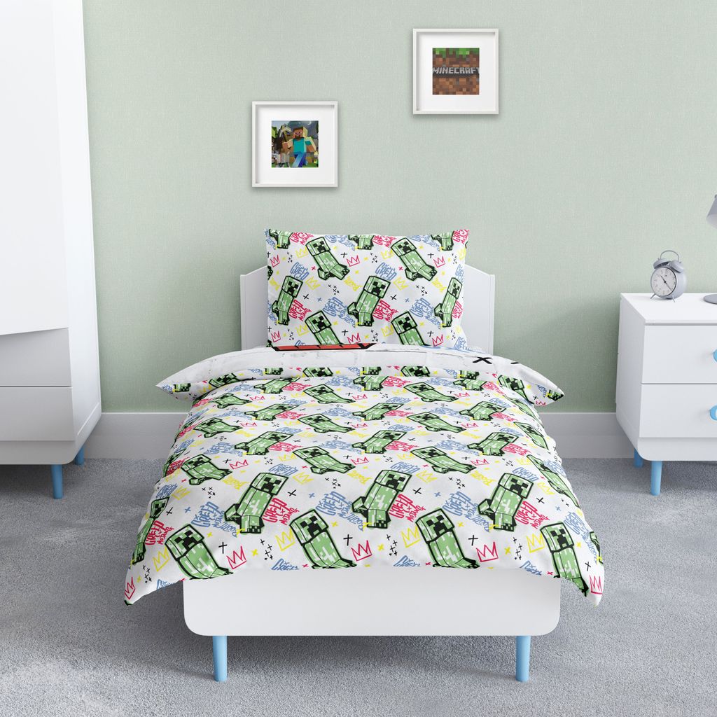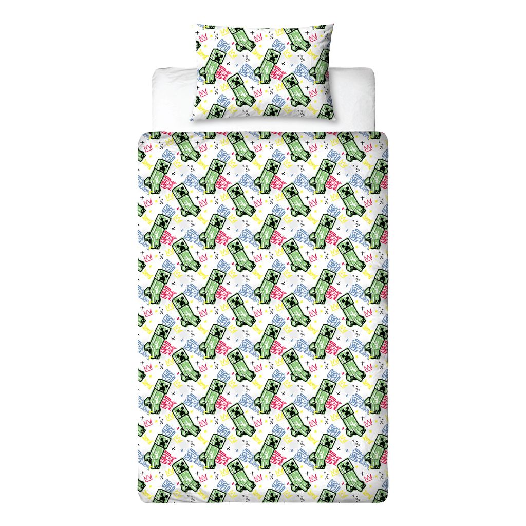 Detta bäddset är perfekt för Minecraft-fans som gillar action och äventyr. Vändbar design betyder att barnet kan välja stil efter humör – tufft graffiti-motiv ena dagen och lekfullt Creeper-mönster nästa! Påslakanet har praktiska hörnhål som håller täcket på plats, och örngottet har en klassisk kuvertöppning för enkel på- och avklädning.