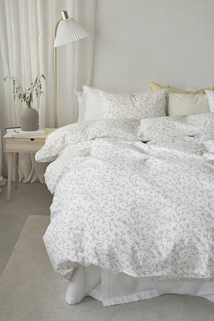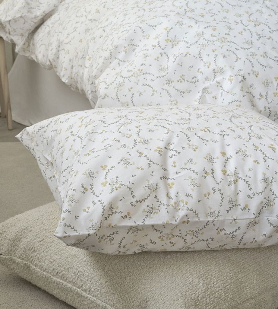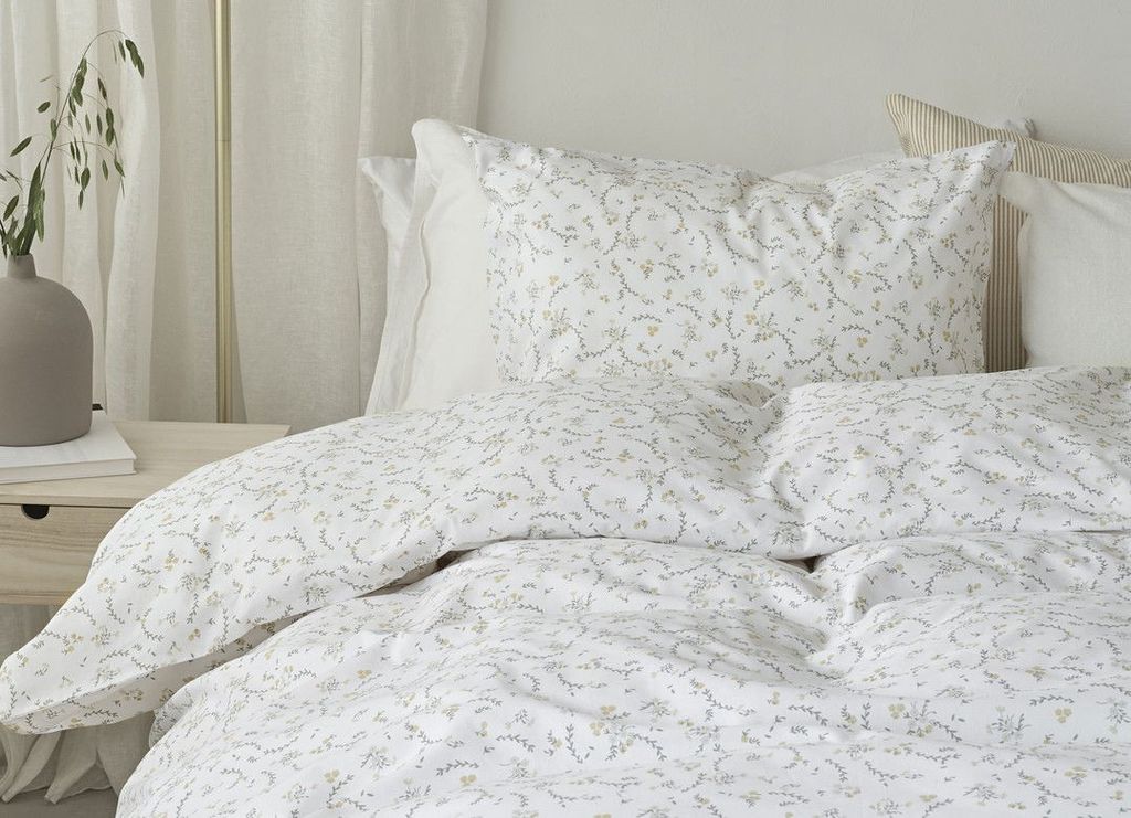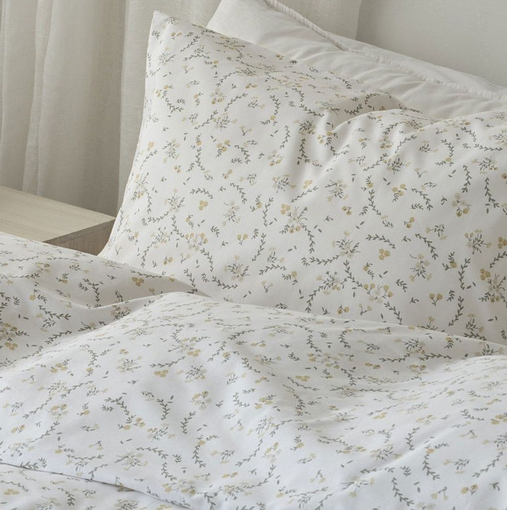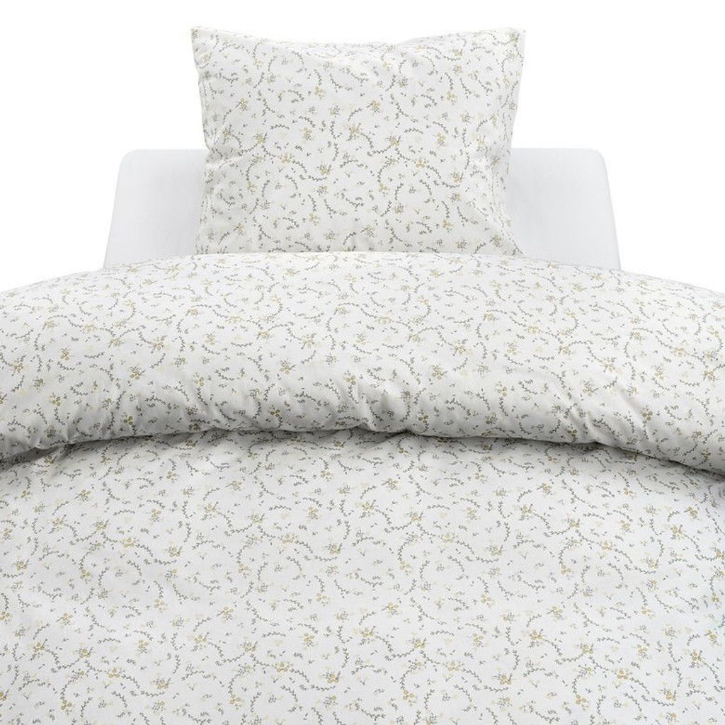 Vilja har en vårig touch med dess vackra, gula småblommor bland gröna löv på en vit bottenfärg som förstärker det fina mönstret och lyfter ut blommorna i sovrummet. Här skapas något nytt och fräscht i sovrummet inför vårens härligheter, samtidigt som natten blir lugn och skön som en härlig äng på våren!